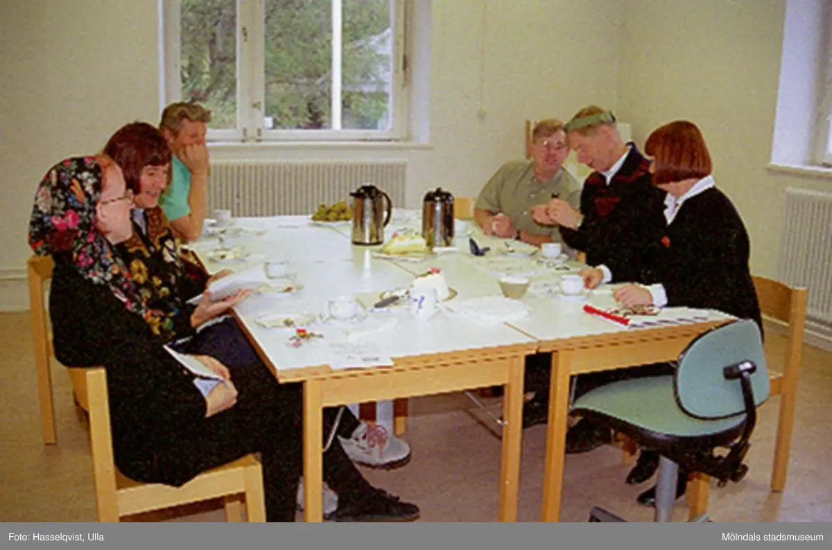 Avtackning av intendent Sten Svensson på Mölndals museum 1994. Sittande på vänster sida: barnkultursekreterare Åsa Kirby, Monica Perman, tekniker Sven-Åke Svensson. Sittande på höger sida från fönstret: tekniker Alf Garthman, intendent Sten Svensson och museichef Mari-Louise Olsson.