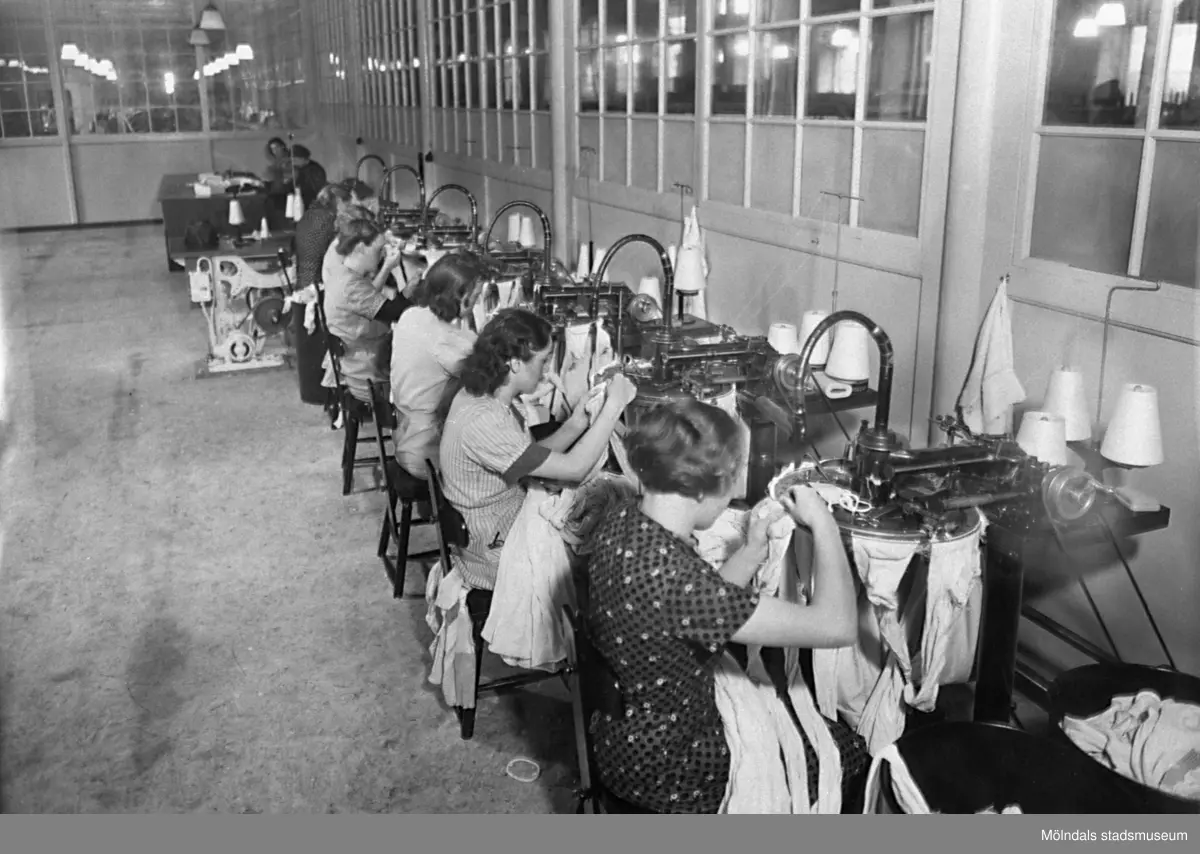 Titel: Kvinnor som arbetar vid maskiner i Viktor Samuelsons fabrik "Strumpan", omkring 1940.