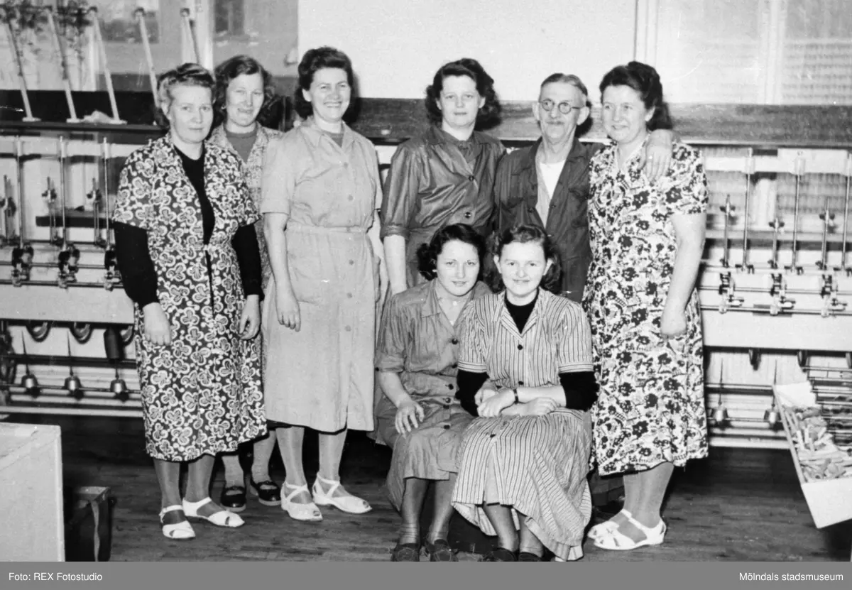Strumpfabriken i Mölndals Kvarnby på 1950-talet. Sju textilarbeterskor samt en förman. Gruppfoto framför spolmaskin. Andra från vänster: Rosemarie Paul, fjärde från vänster: Elin Gustafsson.