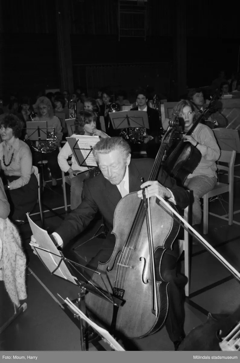 240 medverkande från Chalmers manskör, Collegium Musicum, Mölndals körsällskap, Mölndals vokalensemble, barnkör från Brattåsskolan, Göteborgs Ungdomssymfoniker, Mölndals Musiksällskap samt solister från Storan håller konsert på Ekenskolan i Kållered, år 1984. "Snart 91-årige Robert Vogel är still going strong med sin cello."