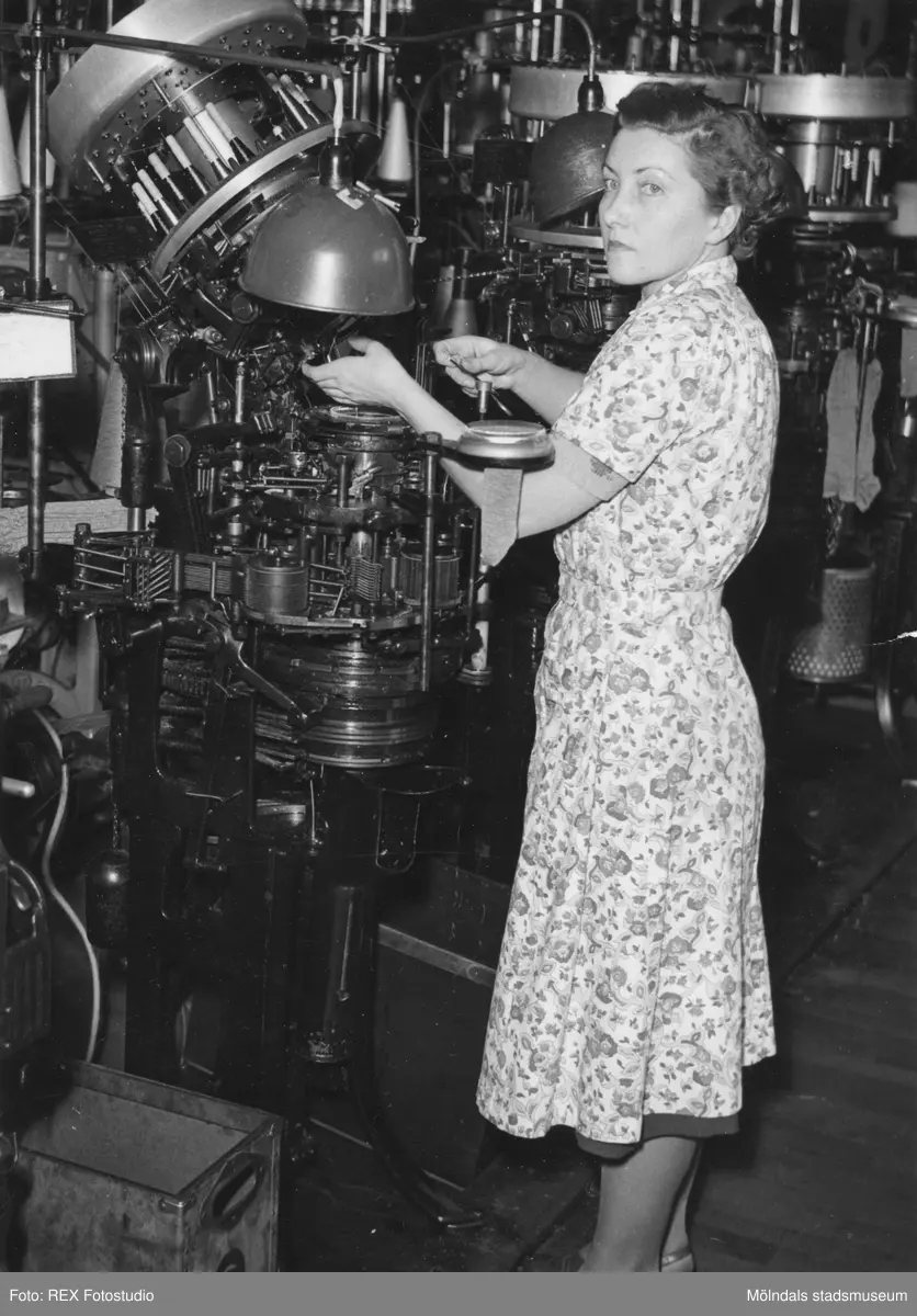 Magit Andersson vid stickmaskinen i "Strumpan" (AB Victor Samuelsons Strumpfabrik), cirka 1950.