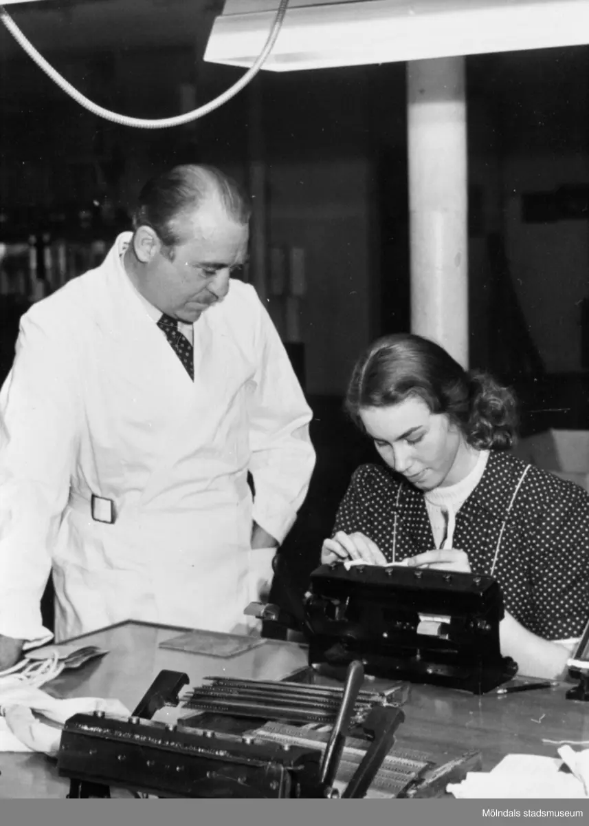 Kaj Larsson granskar en stickerska i arbete på Viktor Samuelsons fabrik "Strumpan", cirka 1940.