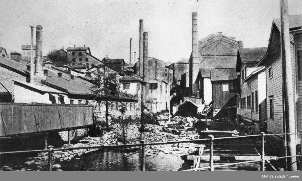 Vykort "Mölndal Fabriksexteriör", postat den 10/1 1940. Vy från Forsebron upp mot Mölndalsfallen. Till vänster ses Delbancos oljeslageri. Uppifrån till höger ses Stora Götafors (Kvarnfallet 22-23, Götaforsliden 13), Kvarnfallet 24 (Nymans kvarn), Kvarnfallet 25 samt Götaforsliden 1-7 direkt till höger.