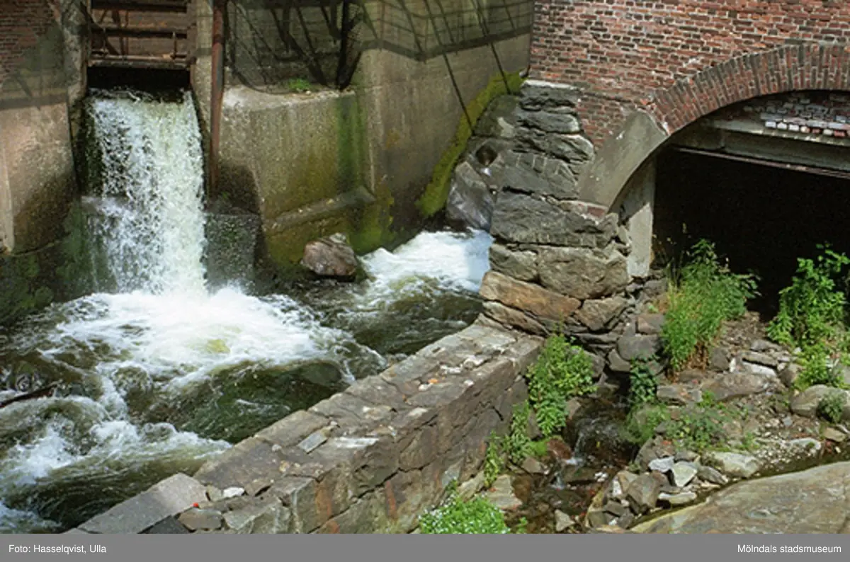 Kulturmiljön vid forsen i Mölndals kvarnby, 1997-07-08. Till vänster ses F-fabriken (Oljeslageriet) och till höger Lilla Götafors fd. vattenränna.