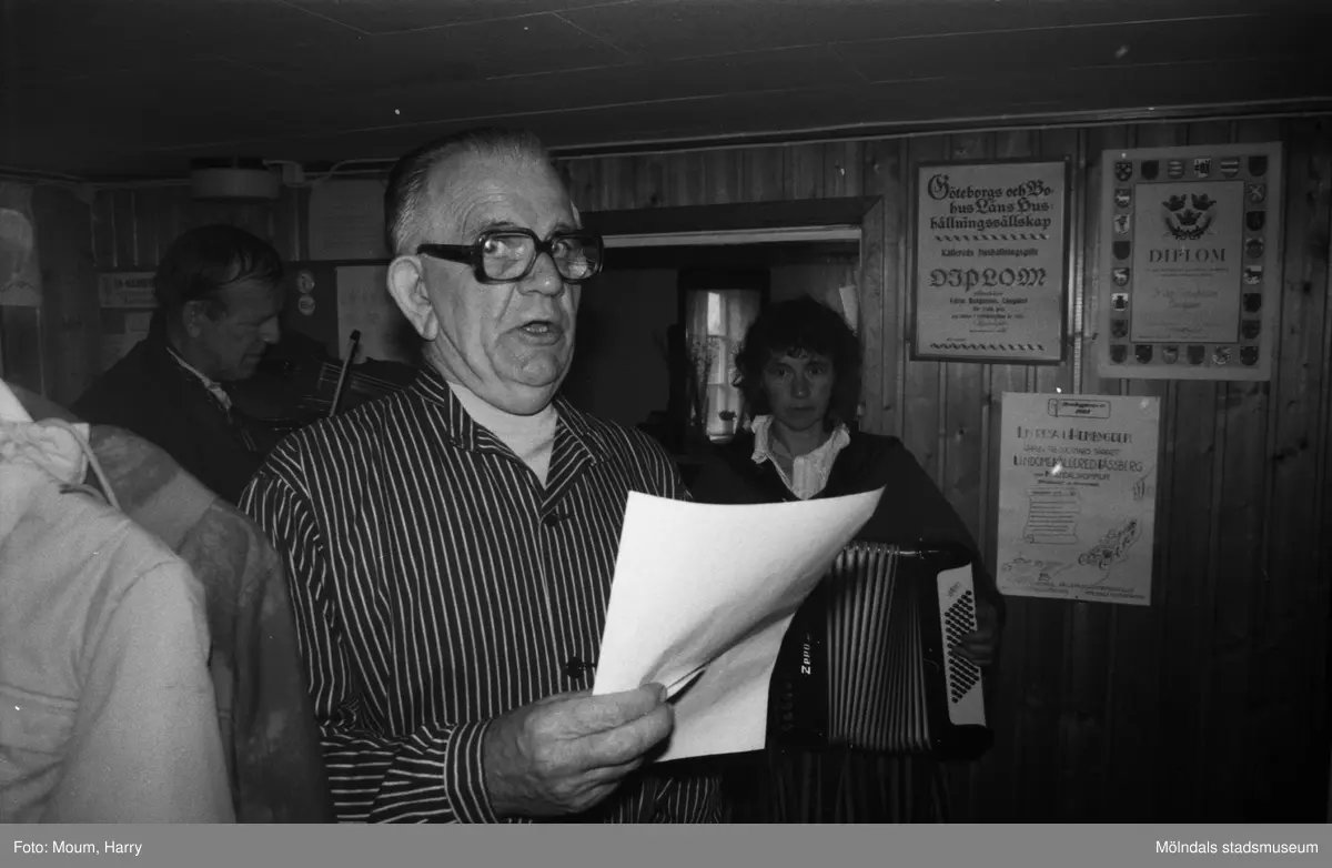 Gökotta i Kållereds hembygdsgård, Långåker år 1985. Främst ses Ivar Andersson och i bakgrunden Kajsa Karlsson från Lindome som spelar dragspel.