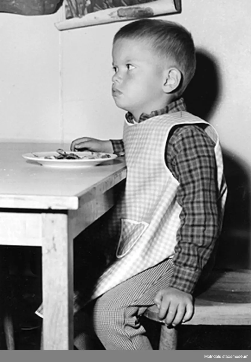En pojke som sitter och äter. Holtermanska daghemmet 1953.