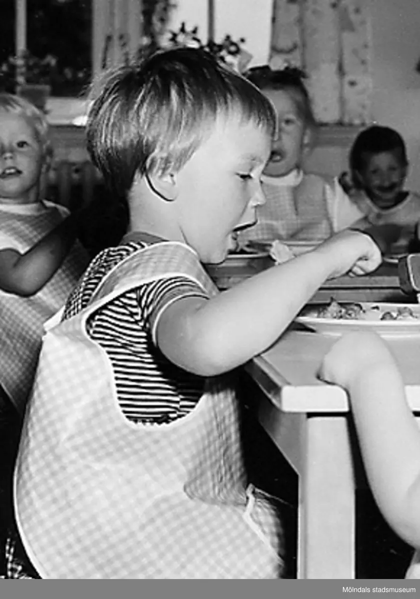 En flicka som äter mat på Holtermanska daghemmet 1953
