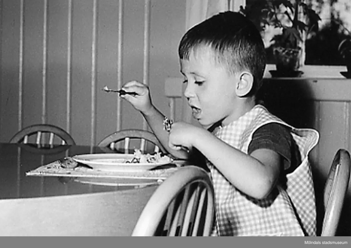 En pojke som äter mat på Holtermanska daghemmet 1953.