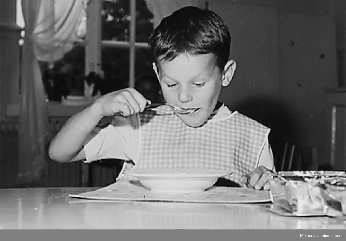 Titel: En pojke som äter mat på Holtermanska daghemmet 1953.