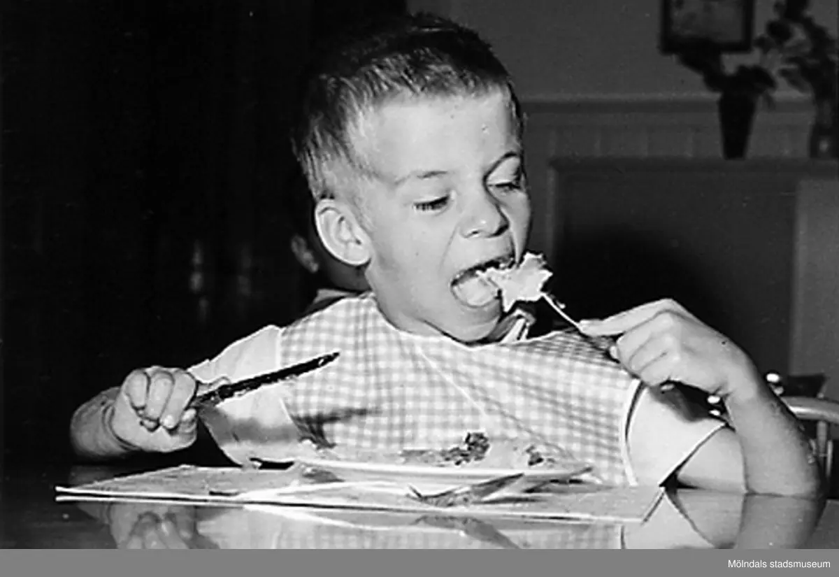 En pojke som sitter och äter. Holtermanska daghemmet 1953.