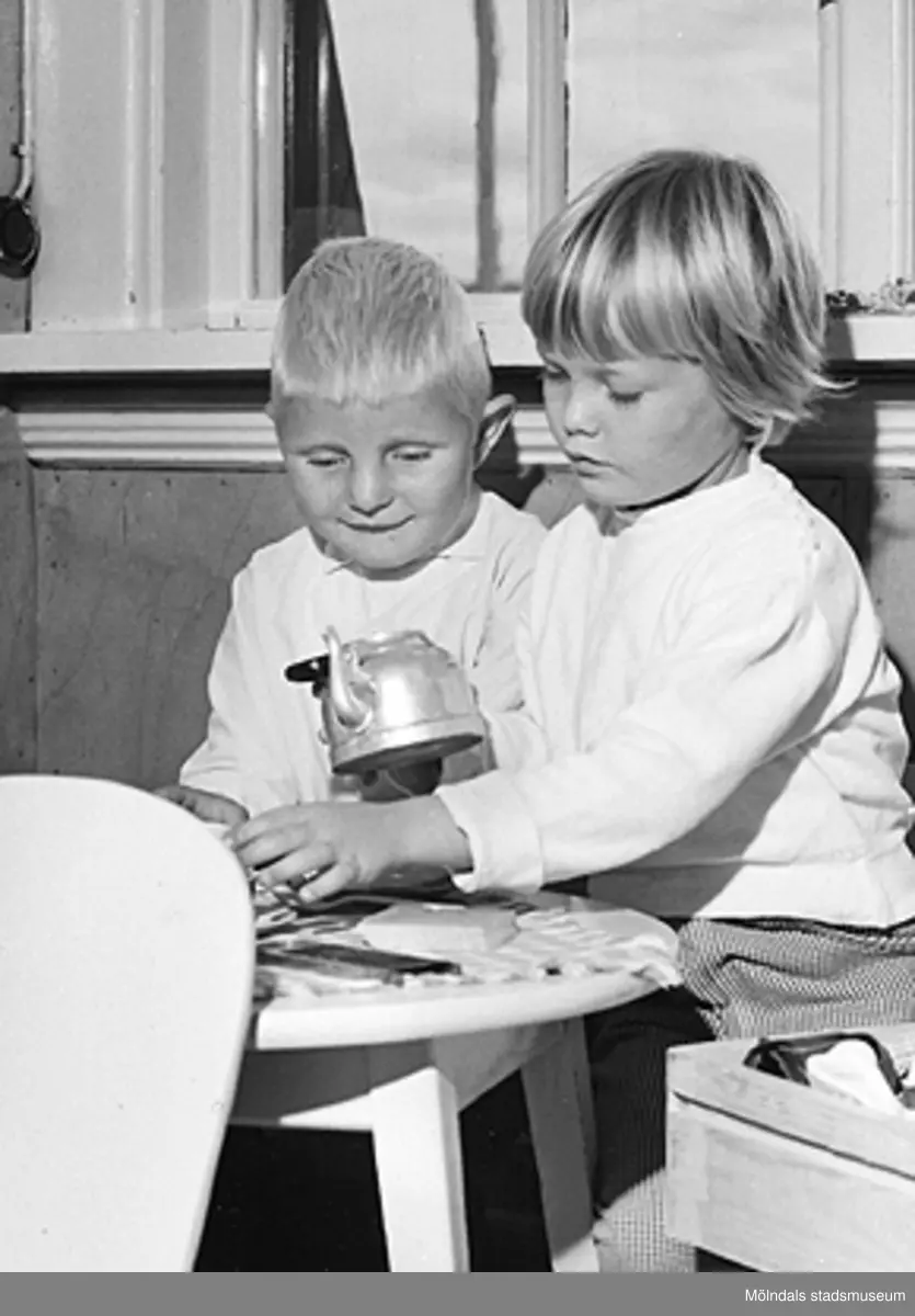 En pojke och en flicka sitter vid ett "kaffebord". Holtermanska daghemmet 1953.