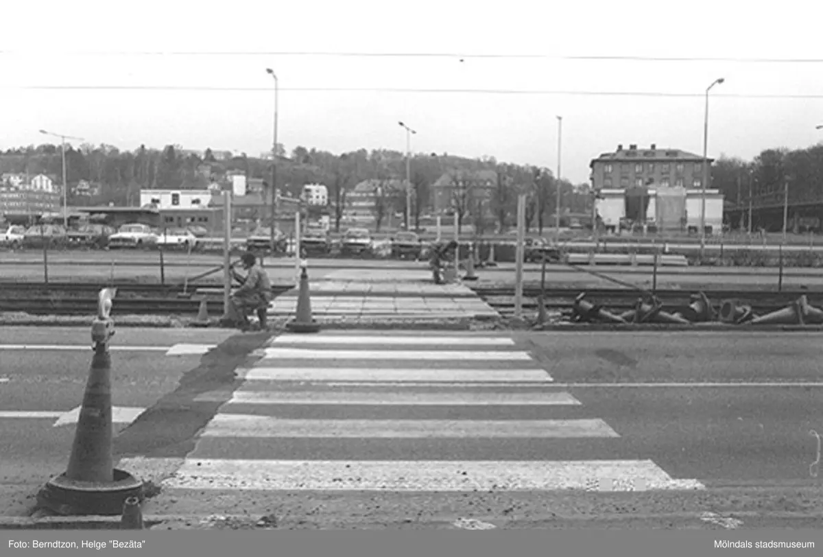 Mölndalsbro i början av 1980-talet. Övergångstället över Göteborgsvägen, mellan Tempelgatan och parkeringen vid ån.