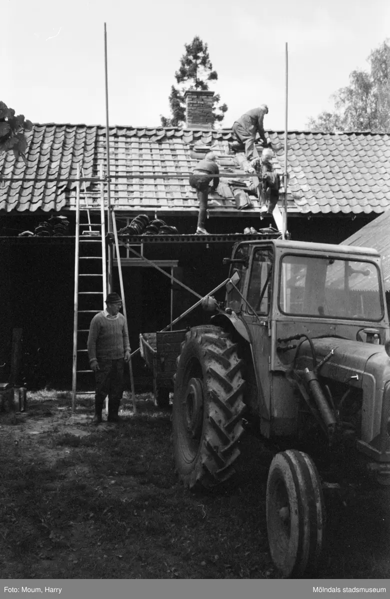 Titel: Hembygdsgården Börjesgården i Hällesåker, Lindome, år 1983. Byggnadsunderhåll på gårdens snickarbod. För mer information om bilden se under tilläggsinformation.