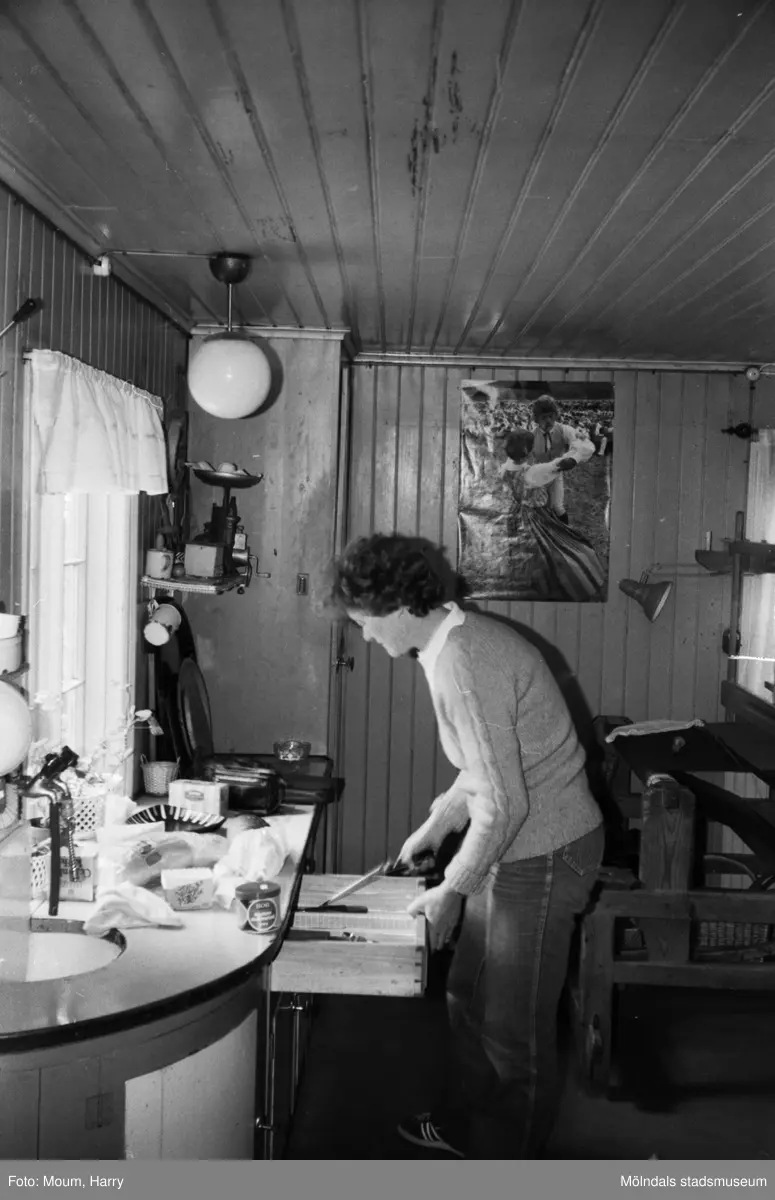 Hembygdsgården Börjesgården i Hällesåker, Lindome, år 1983. "Lindome Hembygdsgilles ordförande Solveig Karlsson pysslar i köket."