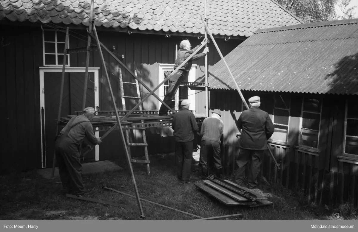 Titel: Hembygdsgården Börjesgården i Hällesåker, Lindome, år 1983. Byggnadsunderhåll på gårdens snickarbod. För mer information om bilden se under tilläggsinformation.
