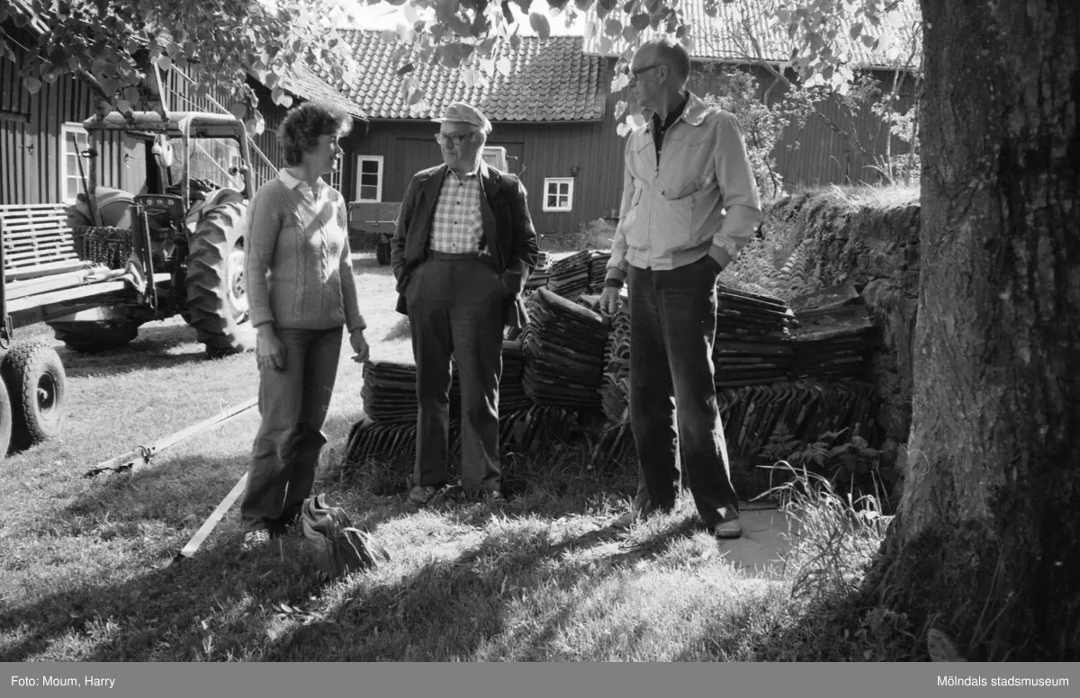 Hembygdsgården Börjesgården i Hällesåker, Lindome, år 1983. En kvinna och två män på gården.