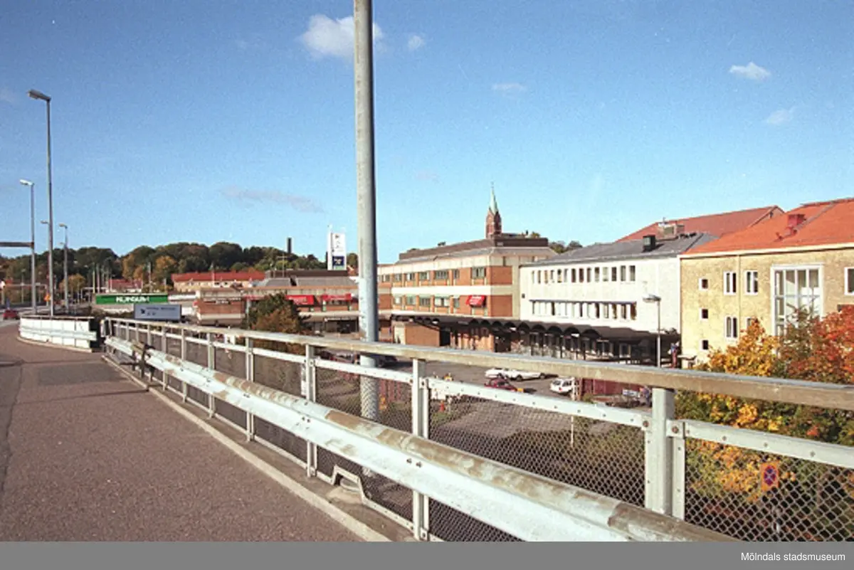Vy västerut över bron. Fässbergs kyrka ses i fonden. Mölndalsbro i dag - ett skolpedagogiskt dokumentationsprojekt på Mölndals museum under oktober 1996. 1996_1116-1134 är gjorda av högstadieelever från Kvarnbyskolan 9C, grupp 6. Se även 1996_0913-0940, gruppbilder på klasserna 1996_1382-1405 samt bilder från den färdiga utställningen 1996_1358-1381.