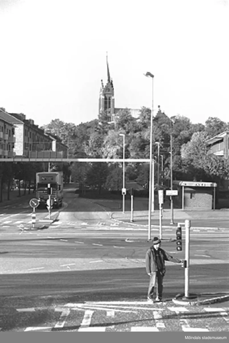 Tempelgatan, Taxistationen och Fässbergs kyrka sedd från Göteborgsvägen. Mölndalsbro i dag - ett skolpedagogiskt dokumentationsprojekt på Mölndals museum under oktober 1996. 1996_1024-1041 är gjorda av högstadieelever från Kvarnbyskolan 9C, grupp 1. Se även 1996_0913-0940, gruppbilder på klasserna 1996_1382-1405 samt bilder från den färdiga utställningen 1996_1358-1381.