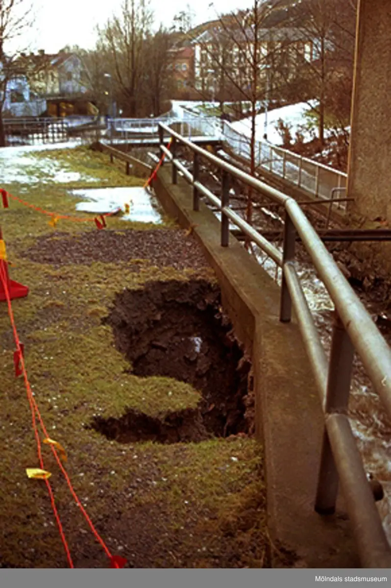 Dokumenterad markskada. Grop i marken vid Mölndalsforsens strandbank från södra sidan vid Stora Götafors (ej i bild) . I bakgrunden ses Gamla stadshuset/Kulturskolan (ljus, hög byggnad med röda detaljer).