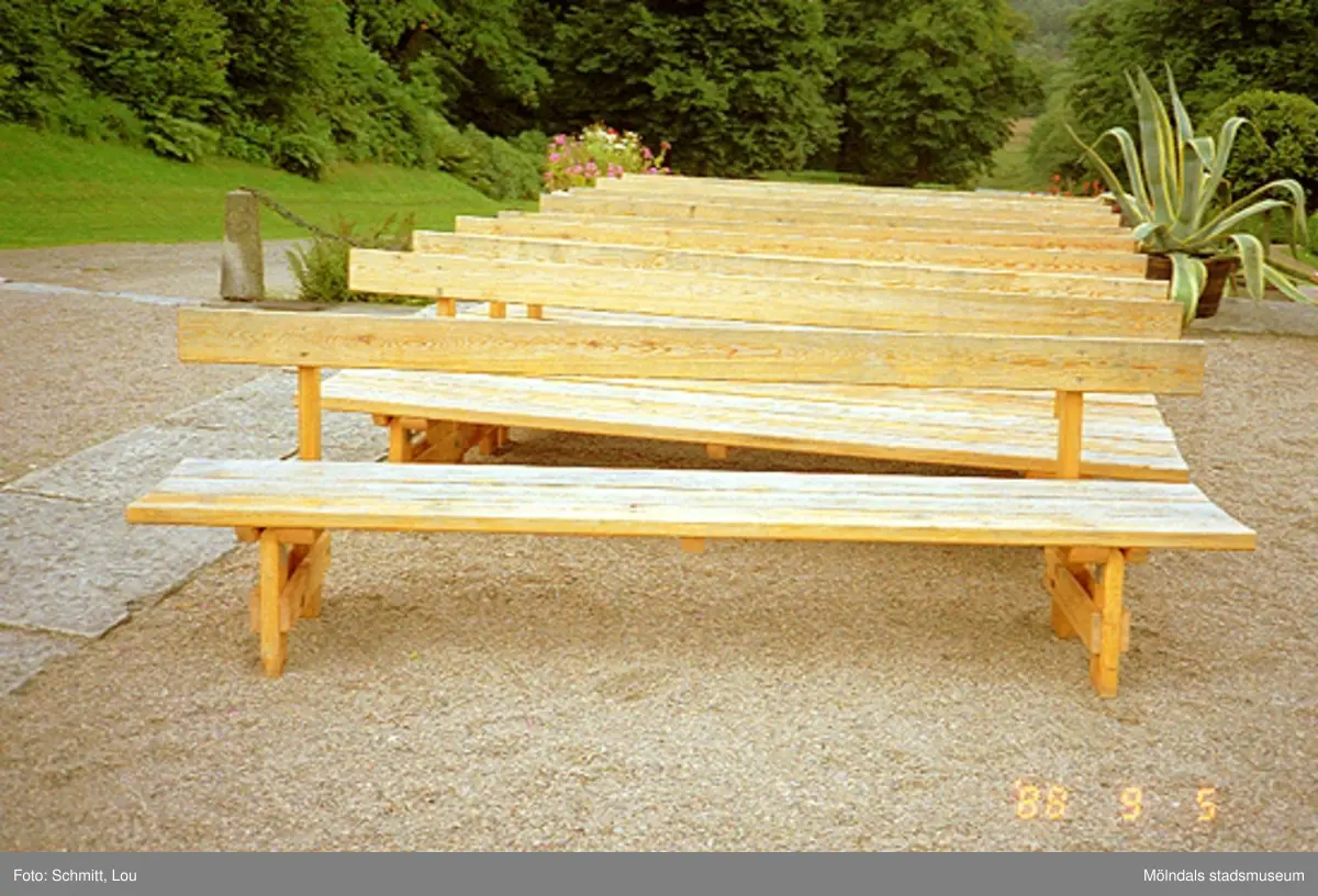 Träbänkar till åskådarplatser framför Gunnebo slott.