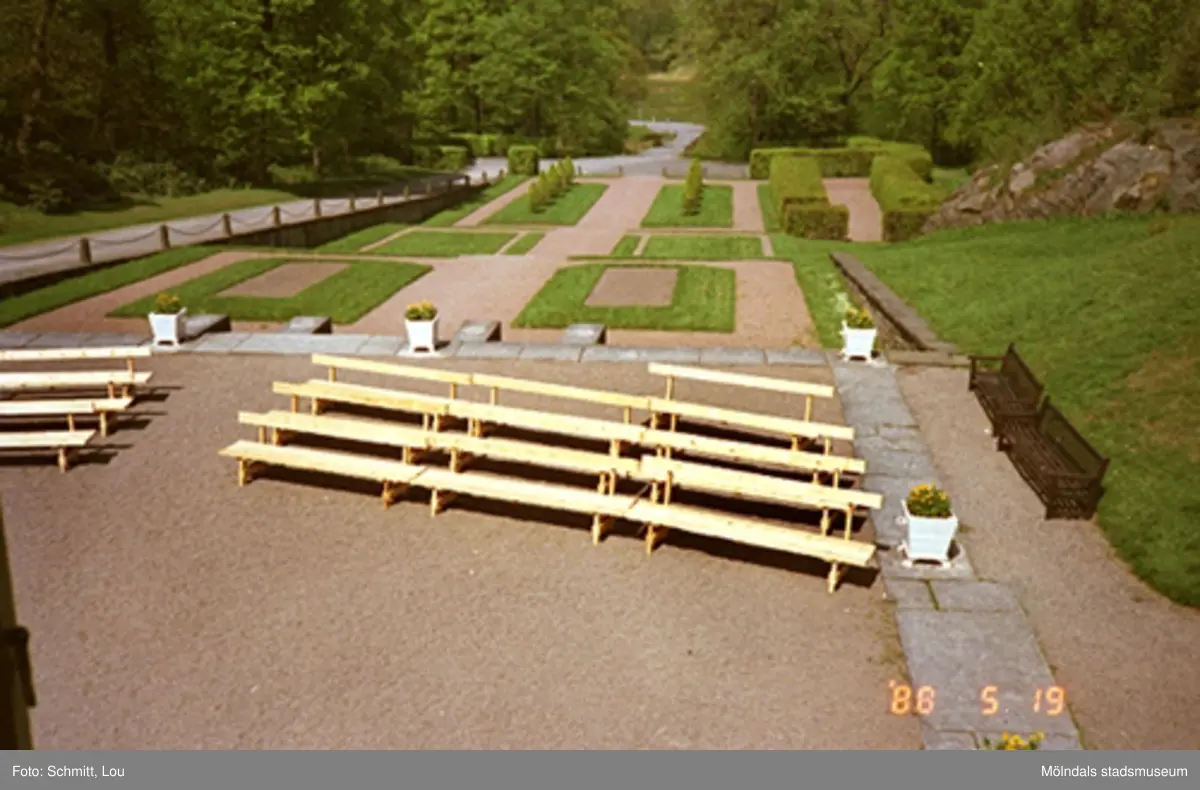 Några bänkar i förgrunden till Gunnebo slott, med parken i bakgrunden.