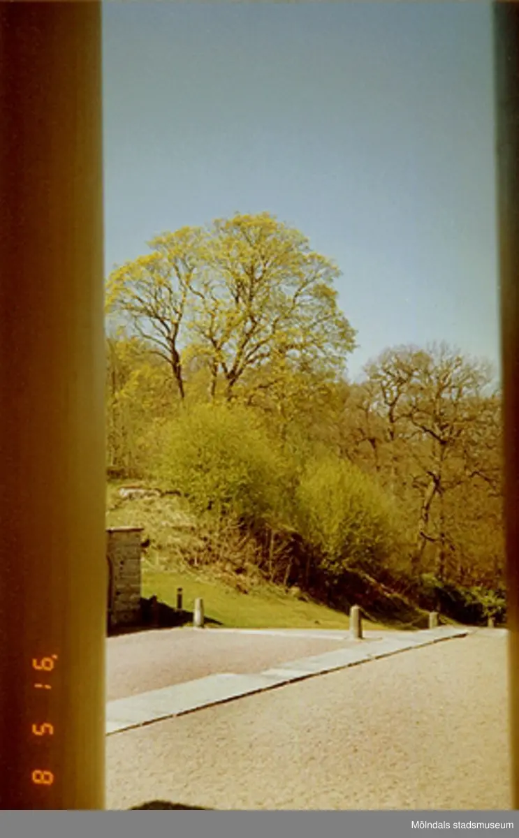Åt vänster ses en skogsdunge med vy från Gunnebo slotts framsida, maj 1991.