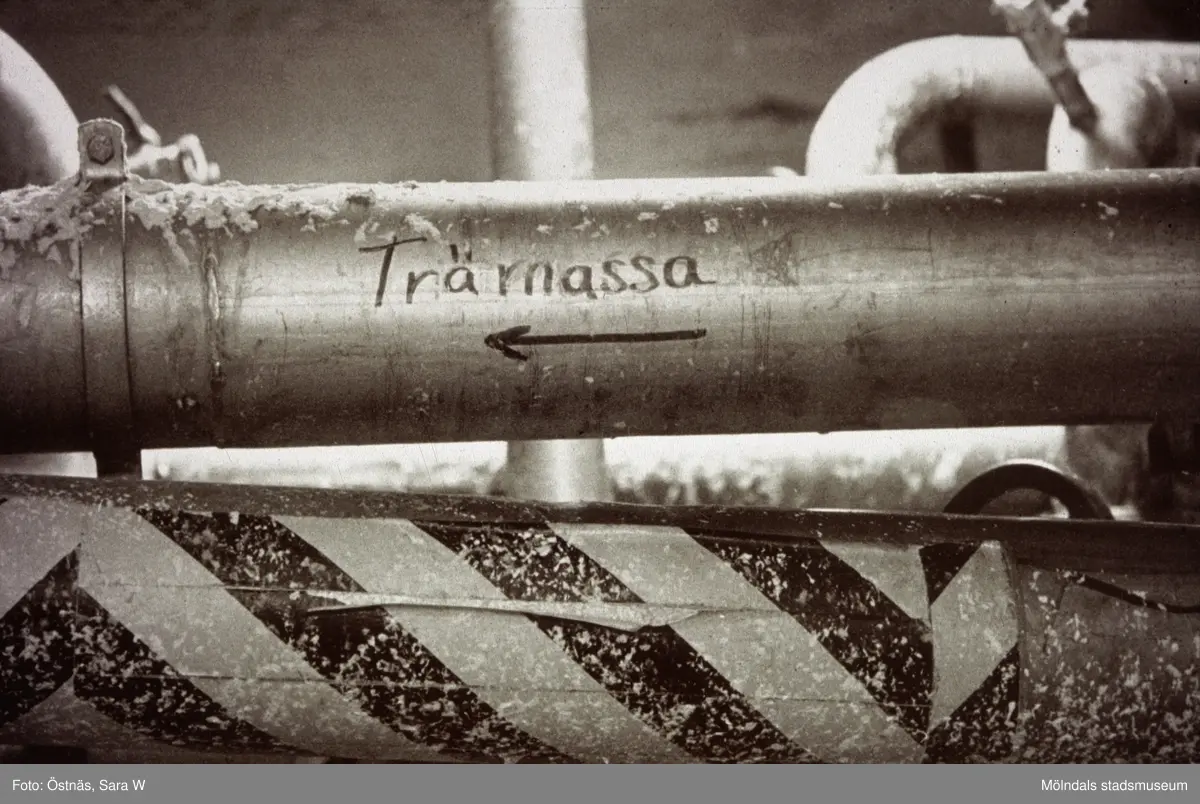 Pappersmassa på väg genom rör på Papyrus i Mölndal, år 1990.