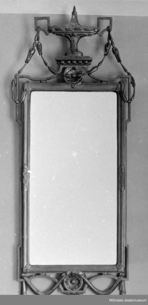 Vägghängd, avlång och dekorerad spegel. Gunnebo slott, 1930-tal.