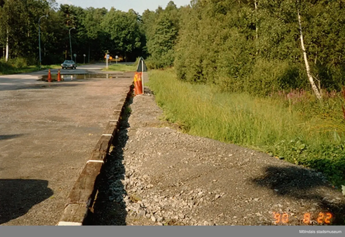 Vägarbete på en väg med skogsbygd runt om. Gunnebo slott, augusti -90.