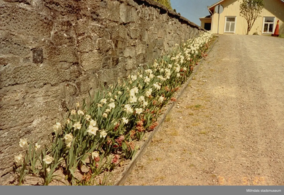 Titel: En stenmur, blomsterrabatt och grusväg som leder från Gunnebo slott till ett bostadshus åt öster. Mitt emot bostadshuset byggdes senare Mölndals turistbyrå. Maj 1991.