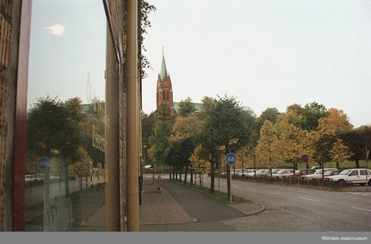 Tempelgatan västerut med Fässbergs kyrka i fonden. Till höger ligger parkeringen vid Stadshuset. Mölndalsbro i dag - ett skolpedagogiskt dokumentationsprojekt på Mölndals museum under oktober 1996. 1996_1301-1319 är gjorda av högstadieelever från Åbyskolan 8A, grupp 4. Se även 1996_0913-0940, gruppbilder på klasserna 1996_1382-1405 och bilder från den färdiga utställningen 1996_1358-1381.