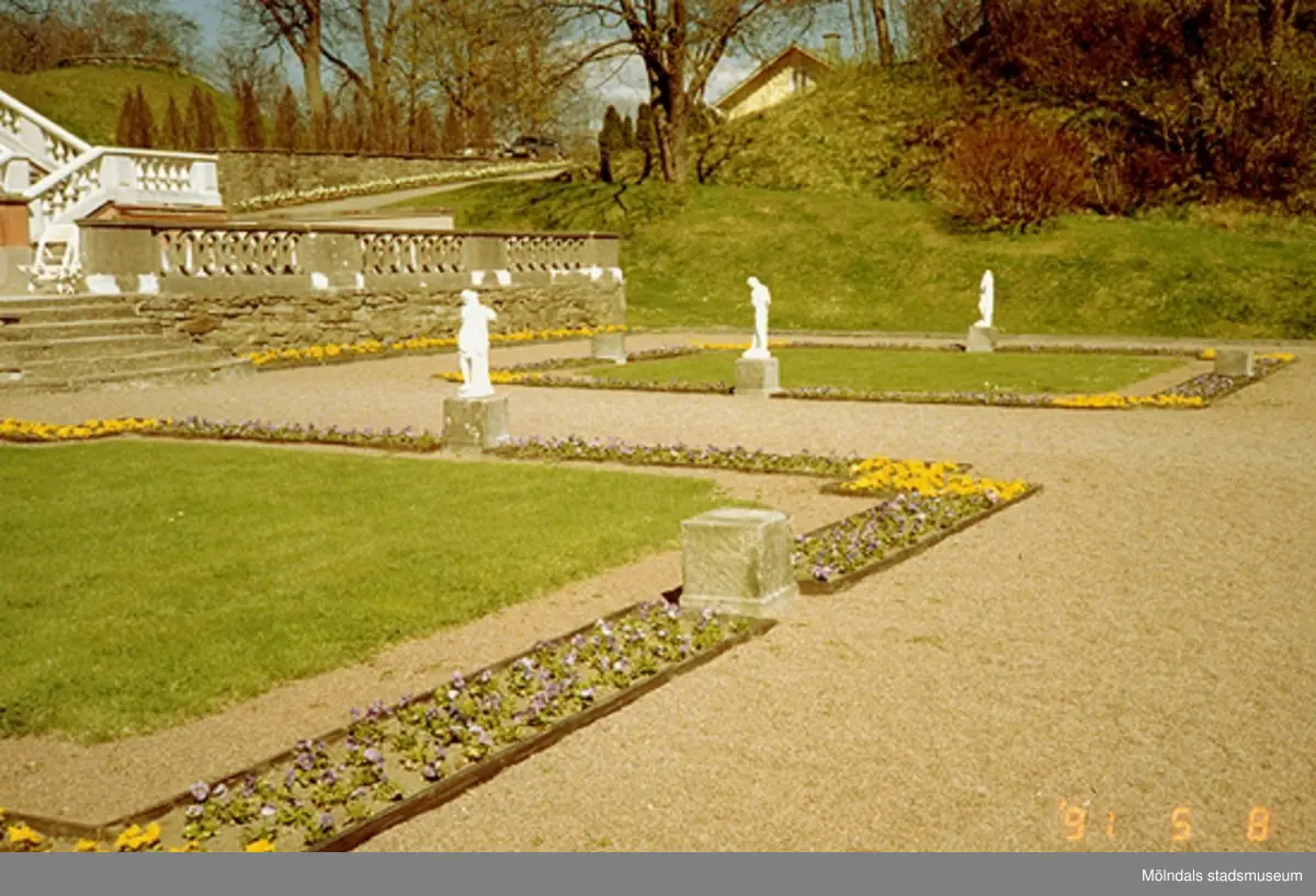 En del av Gunnebo slottsträdgård med blomsterrabatter runt två gräsmattor och tre statyer, som står på varsin sida om gräsmattorna. Maj 1991.