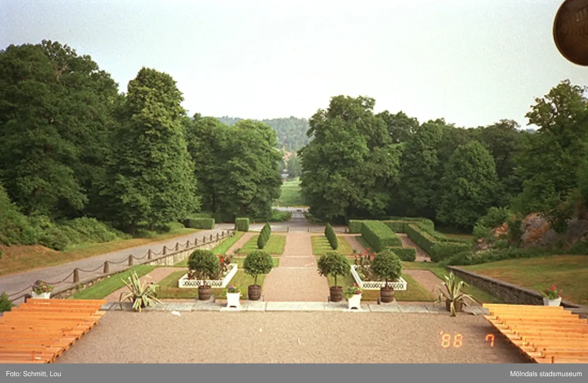 En del av parken vid Gunnebo slotts framsida. Man ser bänkrader, växtlighet, rabatter samt träd i bakgrunden.