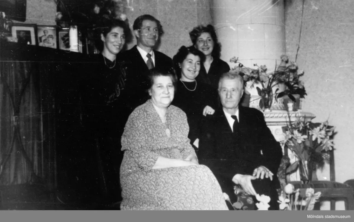 Högtidsdag och uppvakning för trotjänaren Claes Håkansson (kusk/chaufför på Gunnebo slott 1905-1957). Här med fru Wendela Håkansson (husa på Gunnebo slott 1904-1974) samt deras barn Erik (1910-1983), Ingrid (1914-?), Märta (1916-2008) samt Maj-Britt (1922-1999).