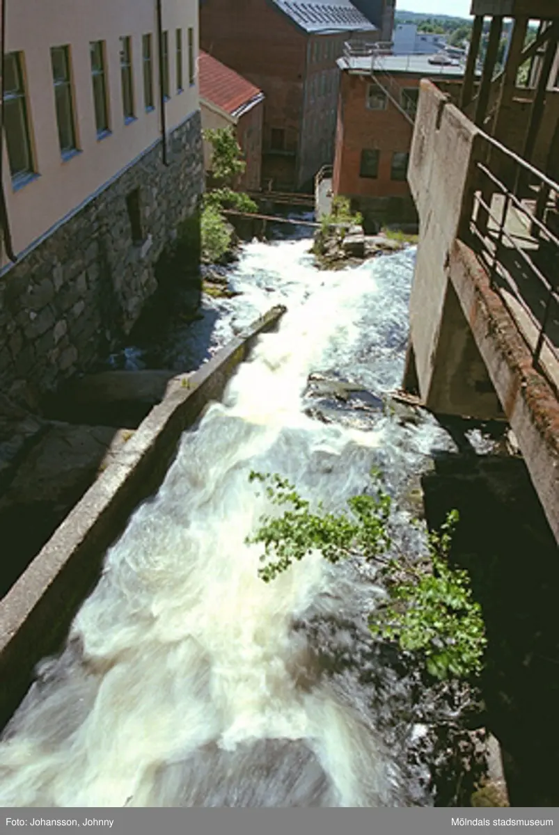 Mölndalsfallen sett ovanifrån, år 1999. Till vänster: Kvarnfallet 18 (Carlsbergs Spinneri, Tvätten), Kvarnfallet 20 (Lilla Götafors).