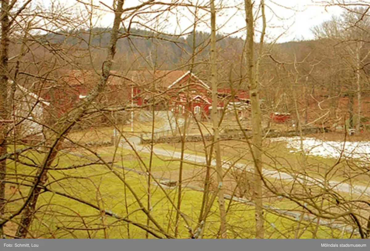 Vy fotograferad genom kvistar, där man ser ladugård/ekonomibyggnader samt delar av ett bostadshus till vänster, tillhörande Gunnebo slott.