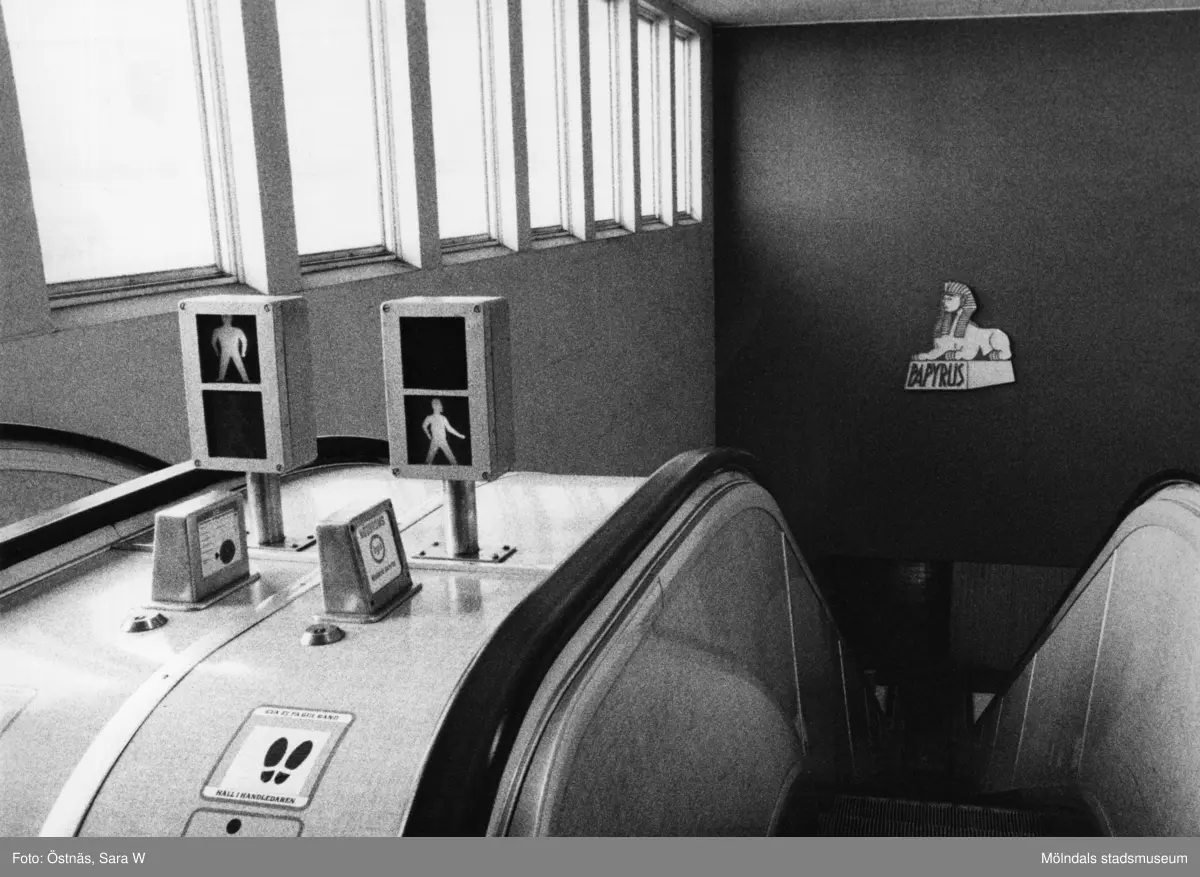 Rulltrappan i entrén till pappersbruket Papyrus vid Kvarnbygatan i Mölndal, år 1990. Rulltrappan var den första i Mölndal och Sveriges andra.