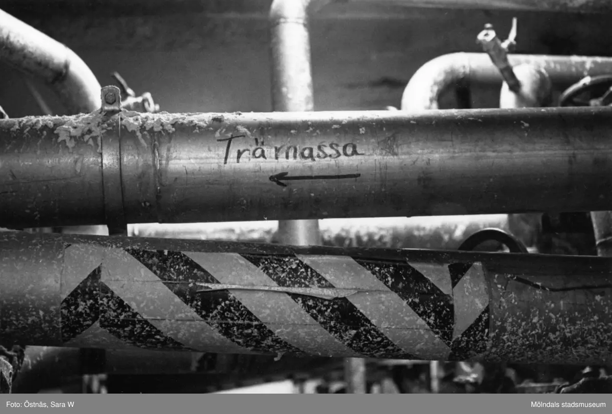 Pappersmassa på väg genom rör på pappersbruket Papyrus i Mölndal, år 1990.