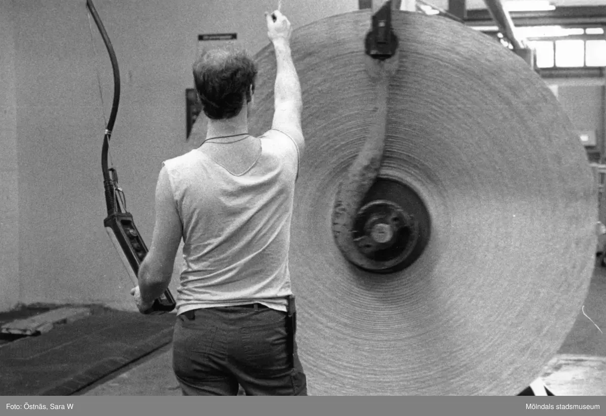 Jan Callesen byter kartongrulle på pappersbruket Papyrus i Mölndal, år 1990.