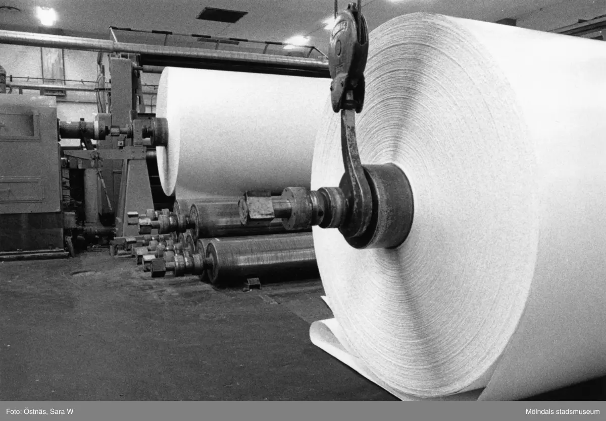 Byte av kartongrulle på pappersbruket Papyrus i Mölndal, år 1990.