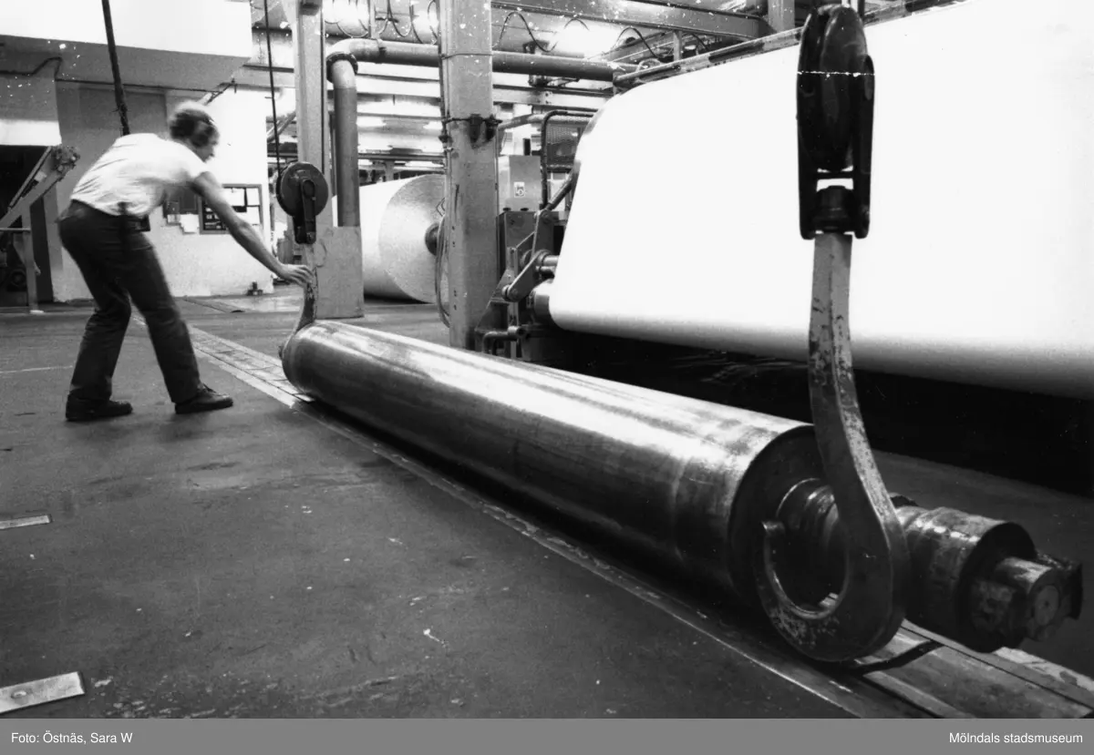 Jan Callesen byter kartongrulle på pappersbruket Papyrus i Mölndal, år 1990.