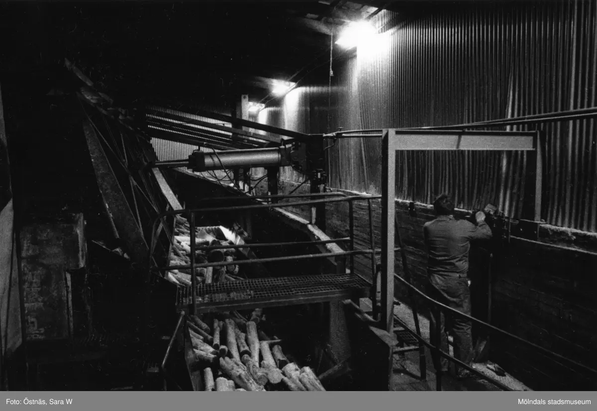 En man övervakar massavedstransport på pappersbruket Papyrus i Mölndal, år 1990.