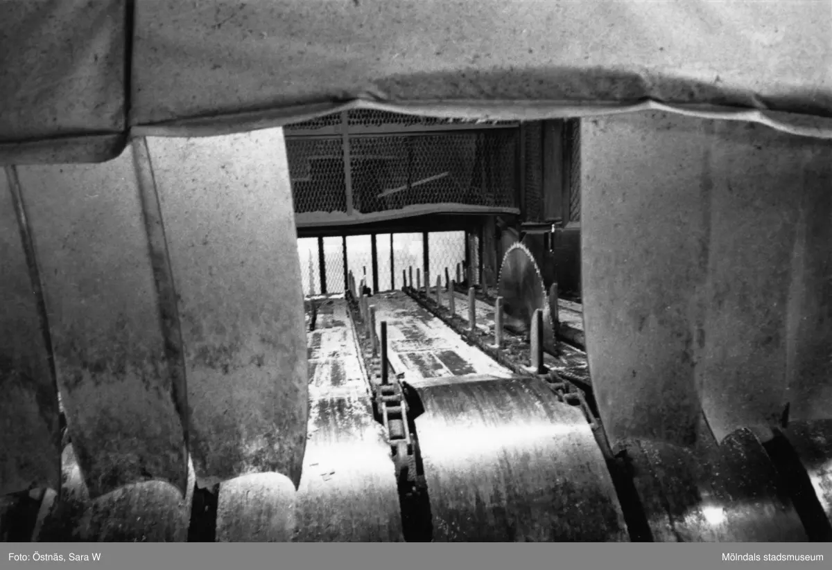 Såg för kapning av massaved på pappersbruket Papyrus i Mölndal, år 1990.