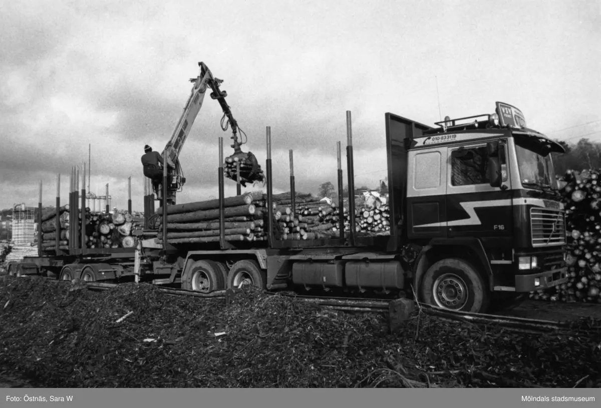 Vedgården utanför sliperiet på pappersbruket Papyrus i Mölndal, år 1990.
