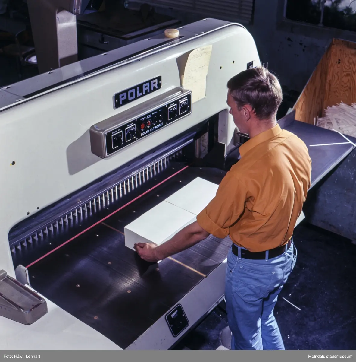 Man i arbete vid skärmaskin på pappersbruket Papyrus i Mölndal, 3/10 1966.