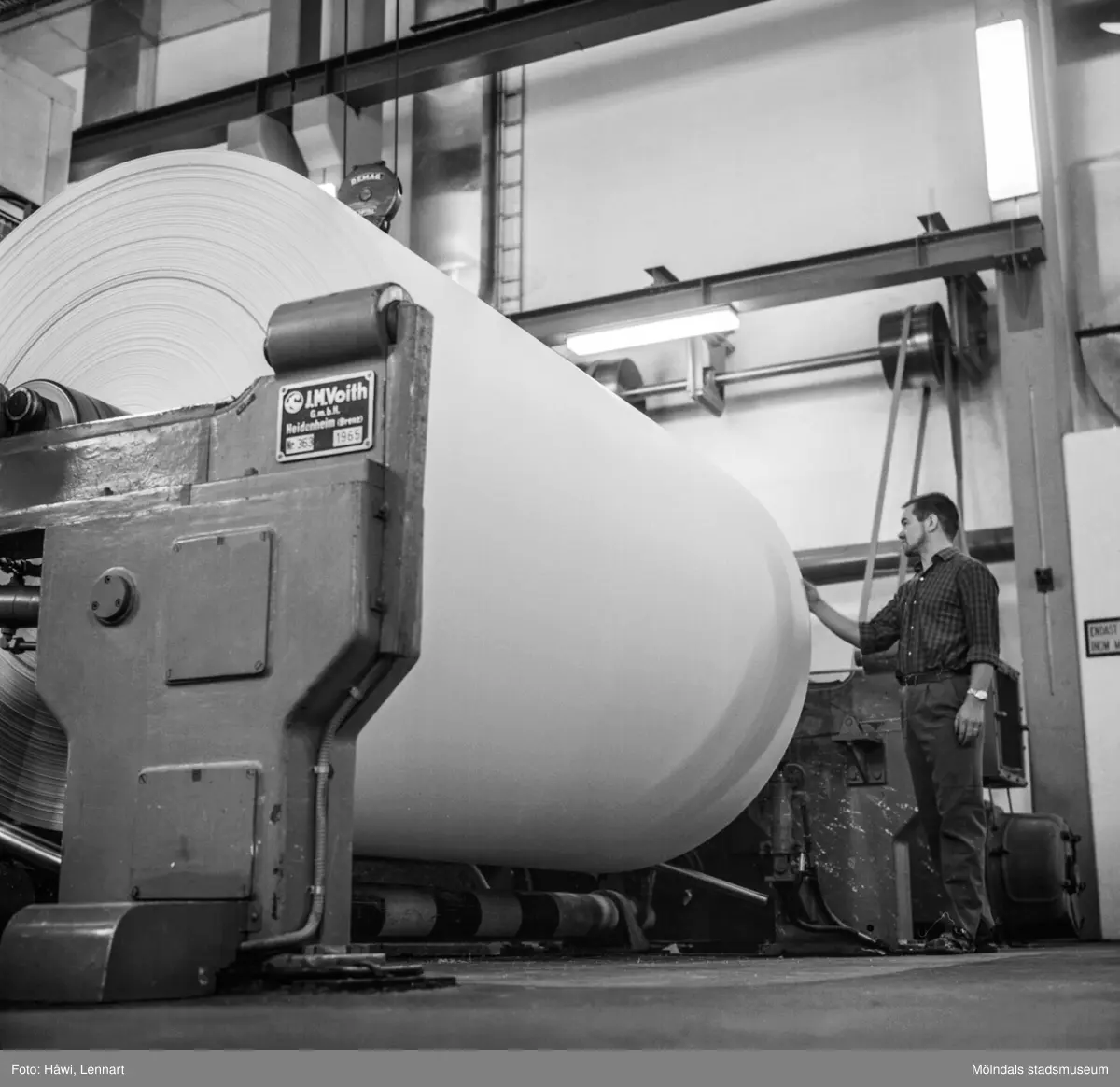 Maskinförare Lennart Pettersson i arbete vid PM5, upprullning, på pappersbruket Papyrus i Mölndal, 7/11 1966.