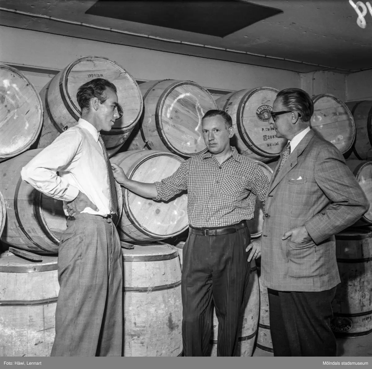 Reportage från pappersbruket Papyrus pressvisning i Mölndal, 29/8 1955. Tre män framför en samling tunnor.