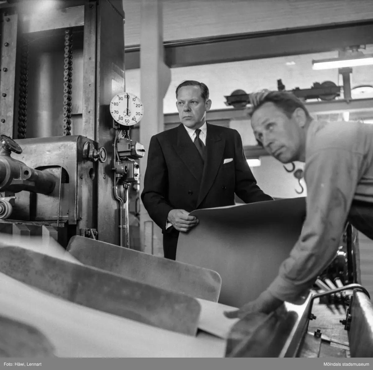 Disponent Hans Hulthén samt arbetare på pappersbruket Papyrus i Mölndal, 15/6 1955.