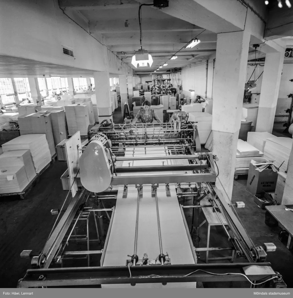 Kvinna i arbete vid sorteringsmaskin på pappersbruket Papyrus i Mölndal, 12/9 1956.