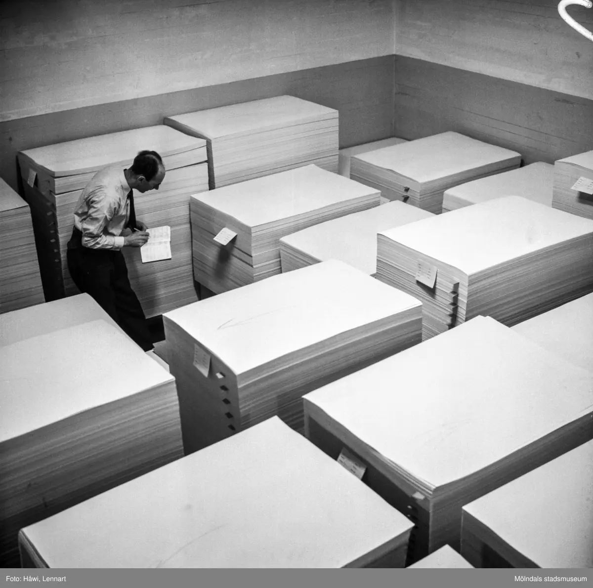 Man i arbete vid kartongfärdigställningen på pappersbruket Papyrus i Mölndal, 1/2 1960. Fotografi för årsberättelsen 1959.